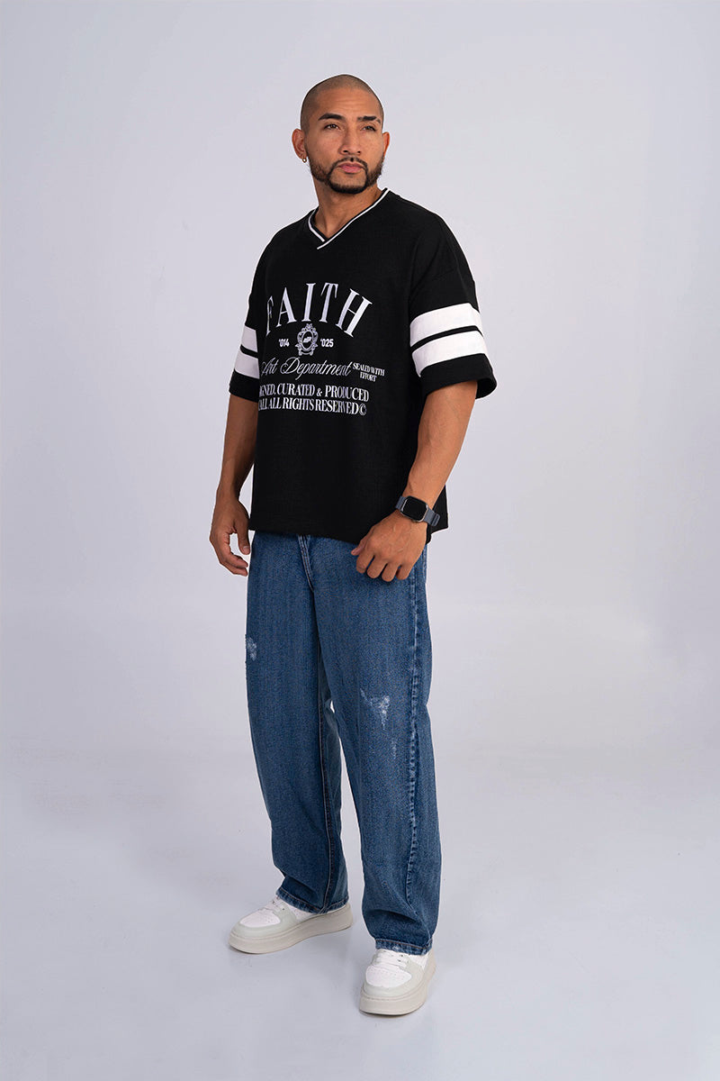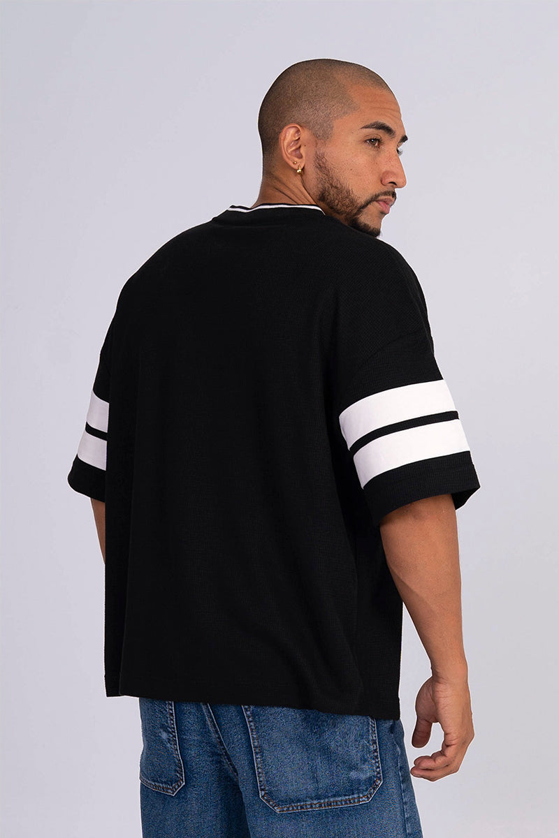 Camiseta boxy fit en negro confeccionada con tela texturizada que aporta profundidad visual y tacto distintivo. Cuello en rib reforzado garantiza durabilidad y mantiene su forma tras múltiples lavados. El corte holgado proporciona comodidad sin sacrificar estilo, ideal para un look casual contemporáneo. Detalles de estampado artístico complementan el diseño minimalista. Prenda versátil que funciona tanto para uso diario como para composiciones más elaboradas.